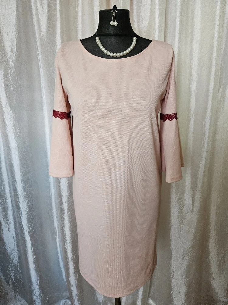 Ručně šité úpletové šaty s kulatým výstřihem a rovným střihem, rukávy jsou v 34 délce, ve spodní časti do zvonu, lemované vínovou elastickou krajkou. Materiál je pevnější světle růžový úplet s jemným vzorem.