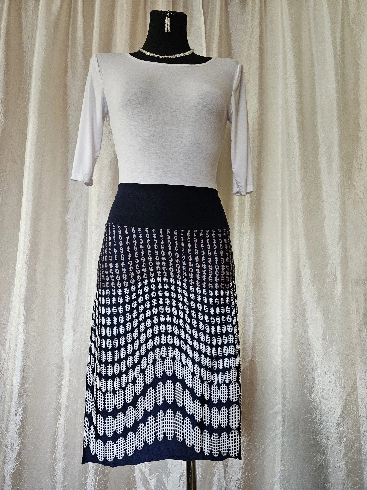 Rovná sukně z modrého úpletu se vzorem – velikost S